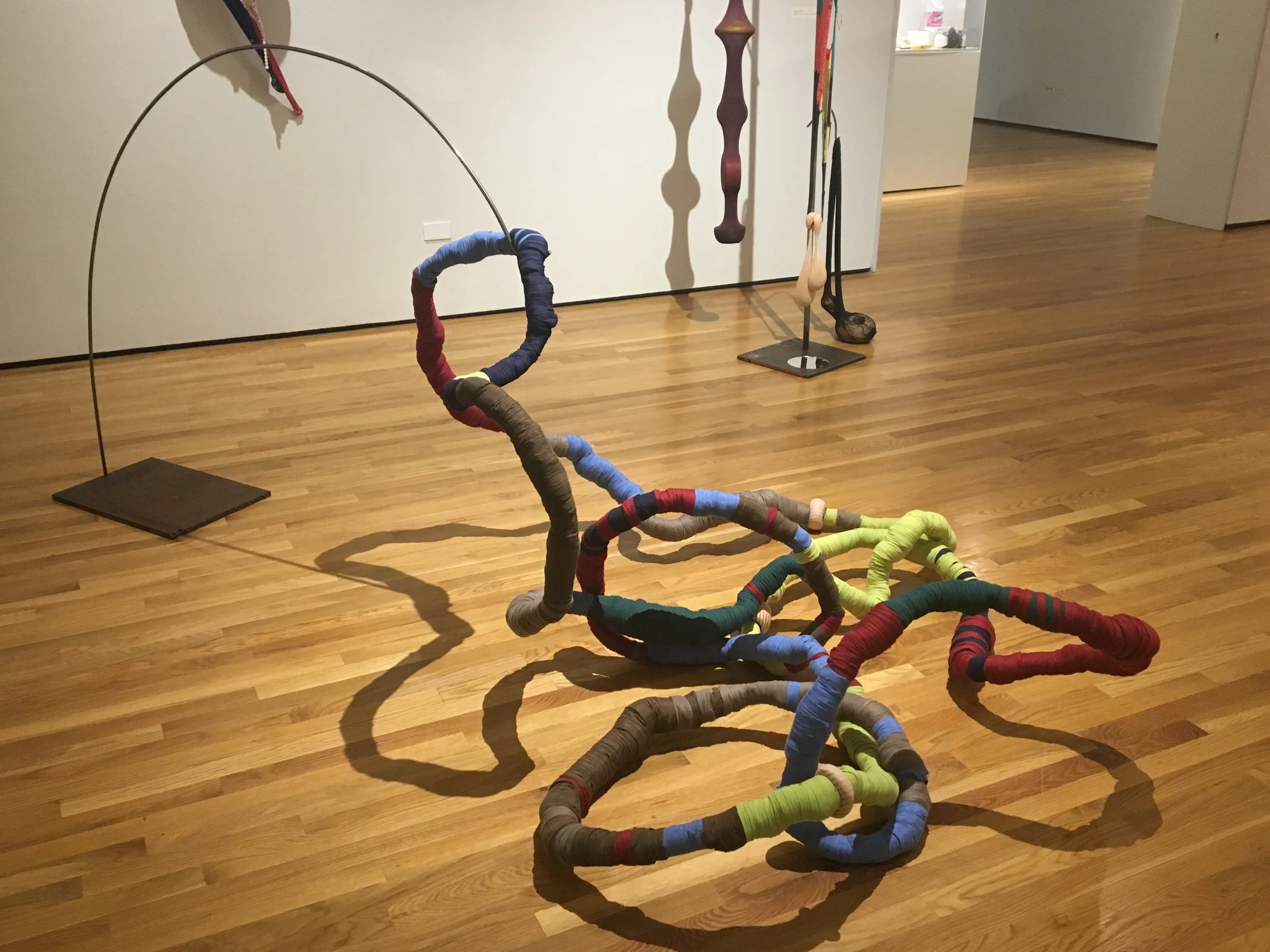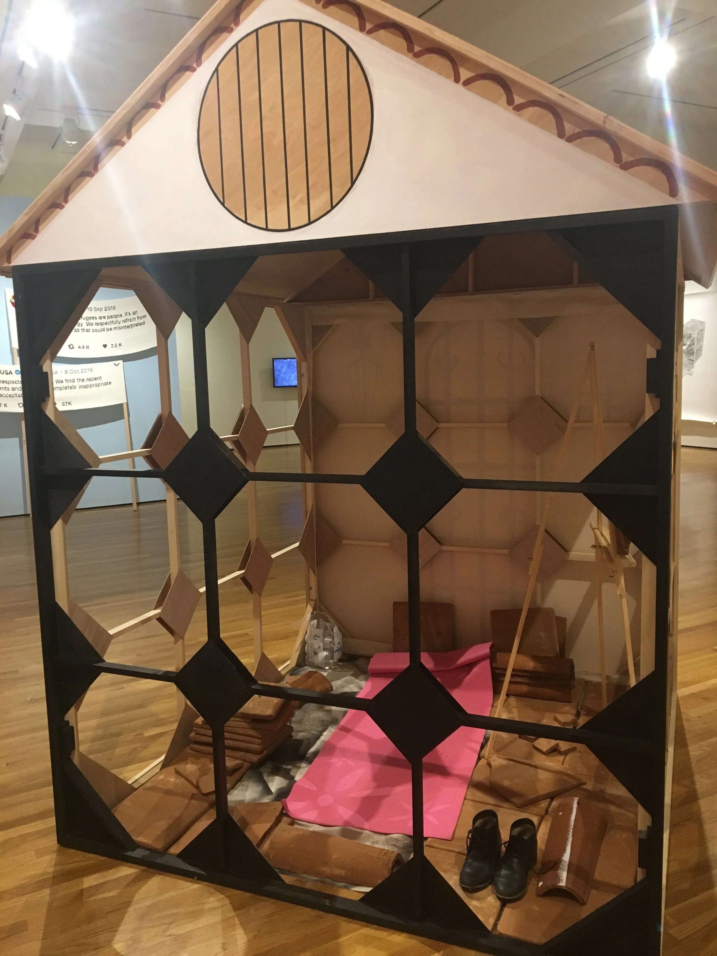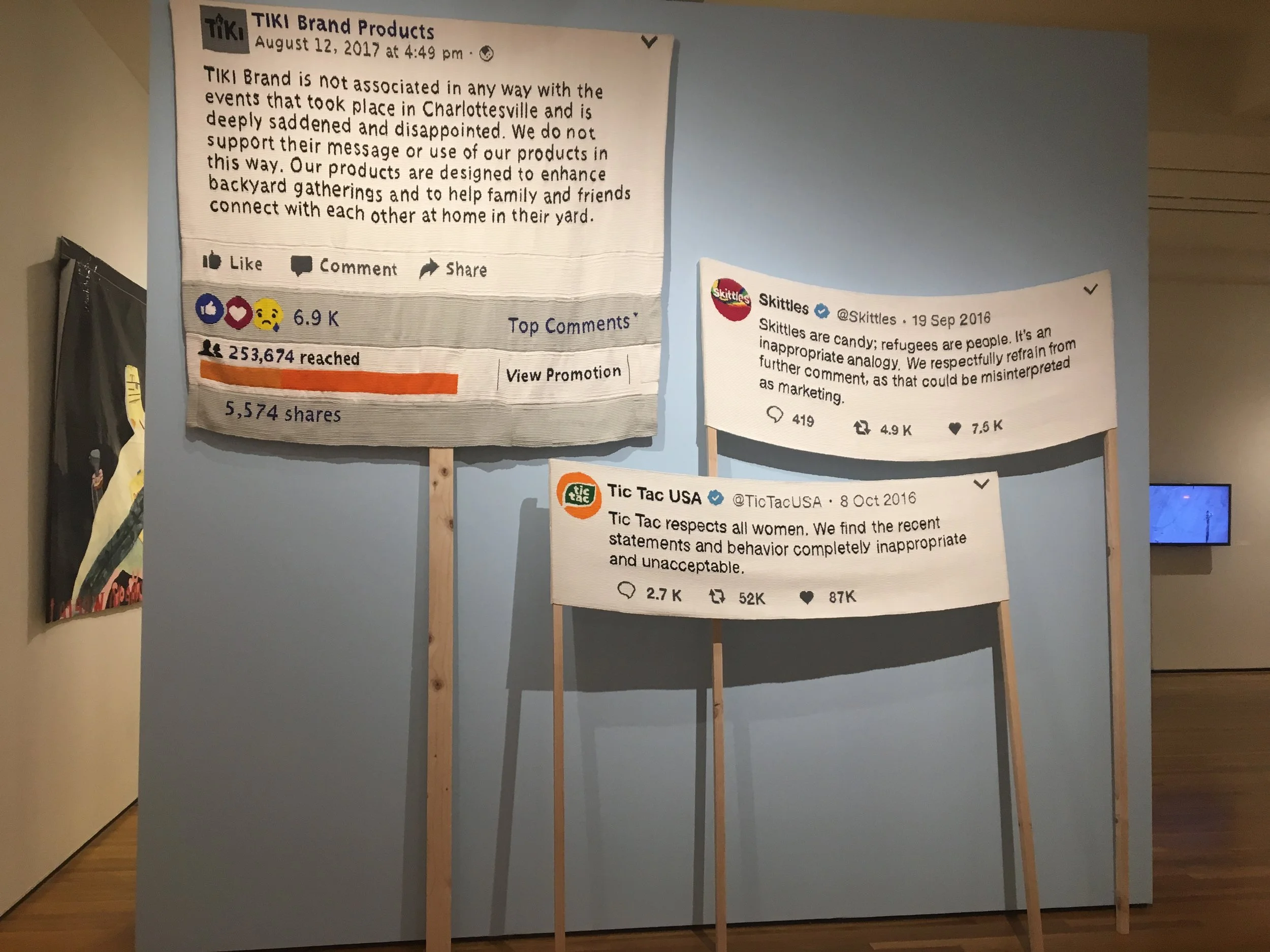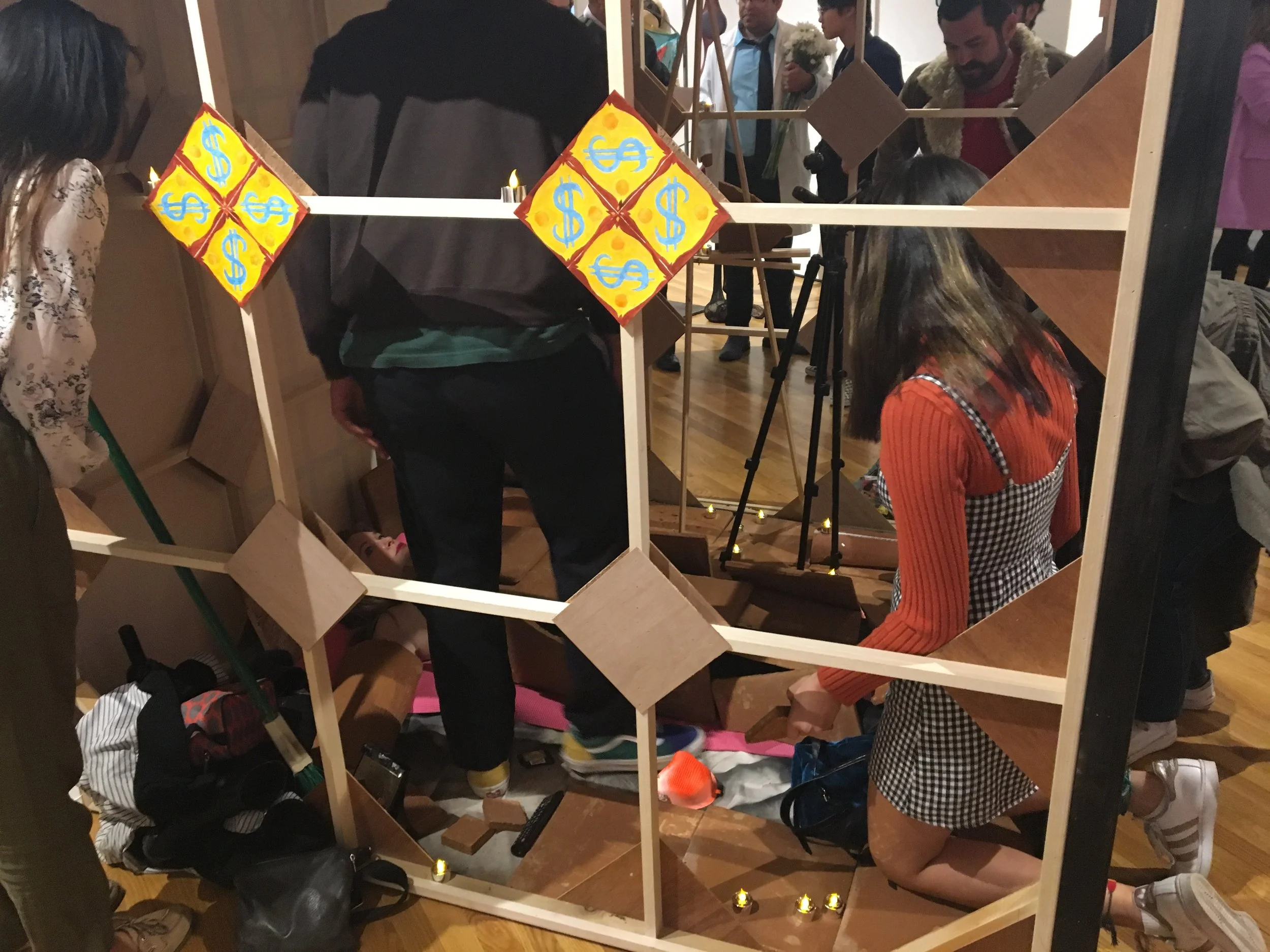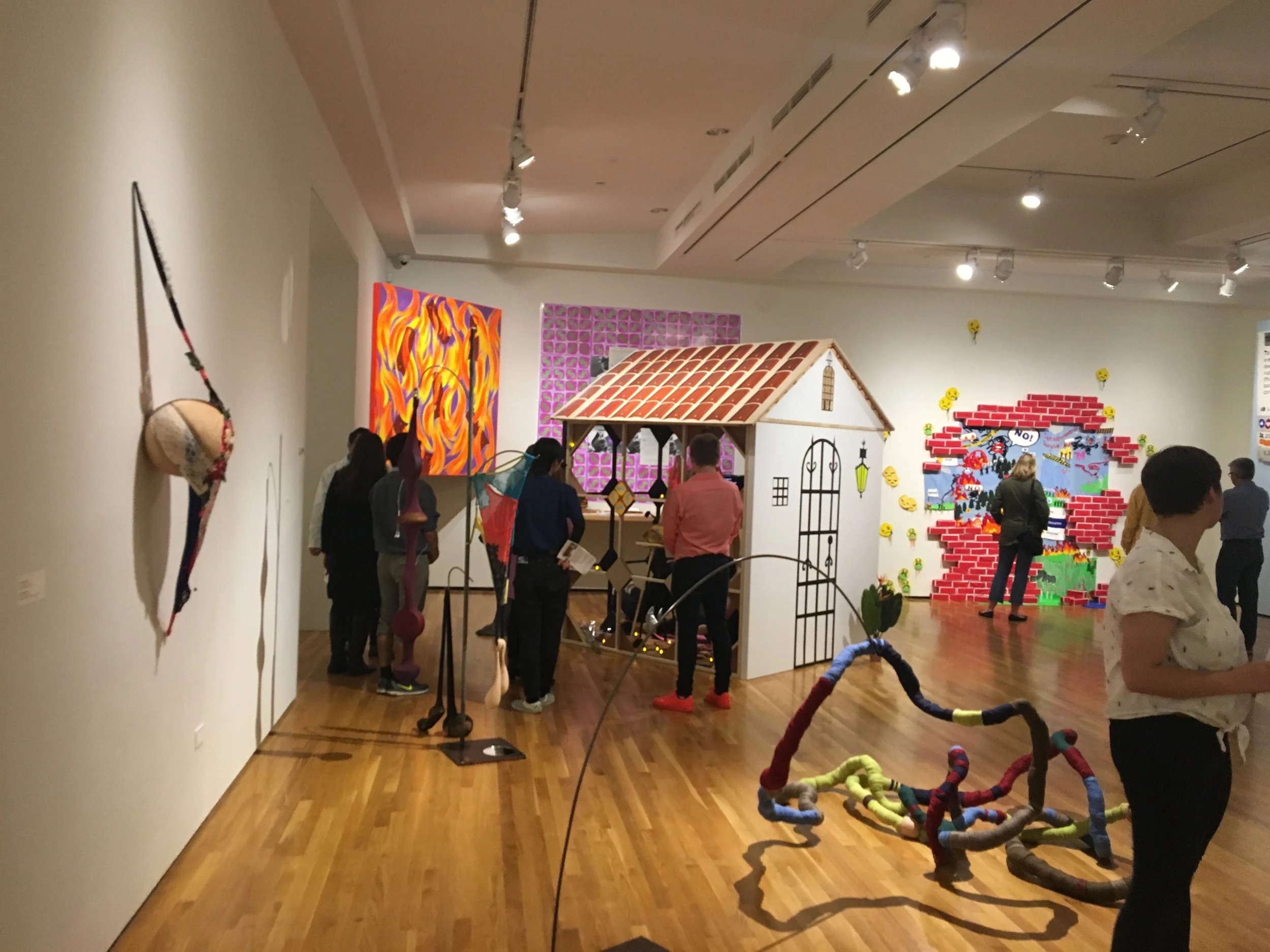 In celebration of the 2019 Master of Fine Arts thesis exhibition, Temporary Clash, The Art, Design, & Architecture Museum held a Friday evening reception in conjunction with the Art Department. Students, faculty, and community members admired the works of the eight featured artists—Maiza Hixson, Madeleine Eve Ignon, Adam Jahnke, Kayla Mattes, Elisa Ortega Montilla, Andrew Morrison, Echo Theohar, and Christopher Anthony Velasco. Temporary Clash highlights the M.F.A. students’ strikingly diverse styles, mediums, and messages, while collectively portraying the human experience.