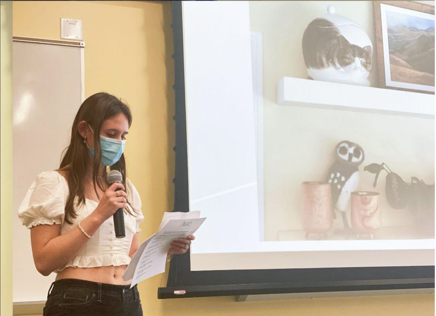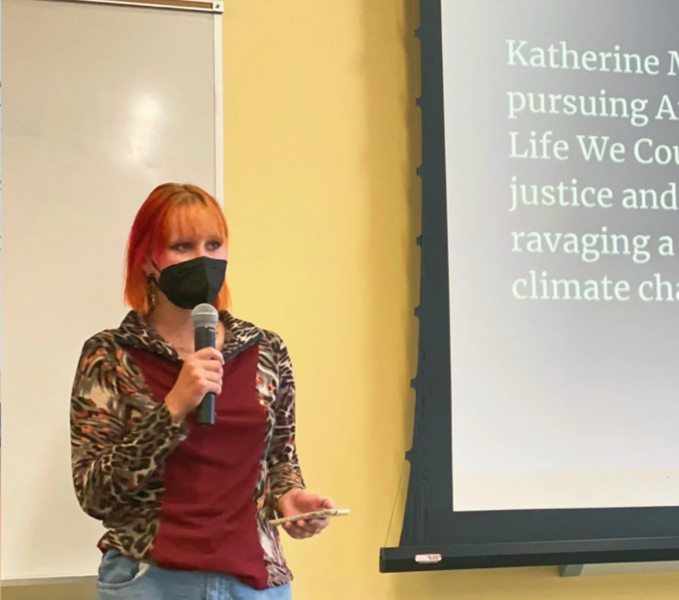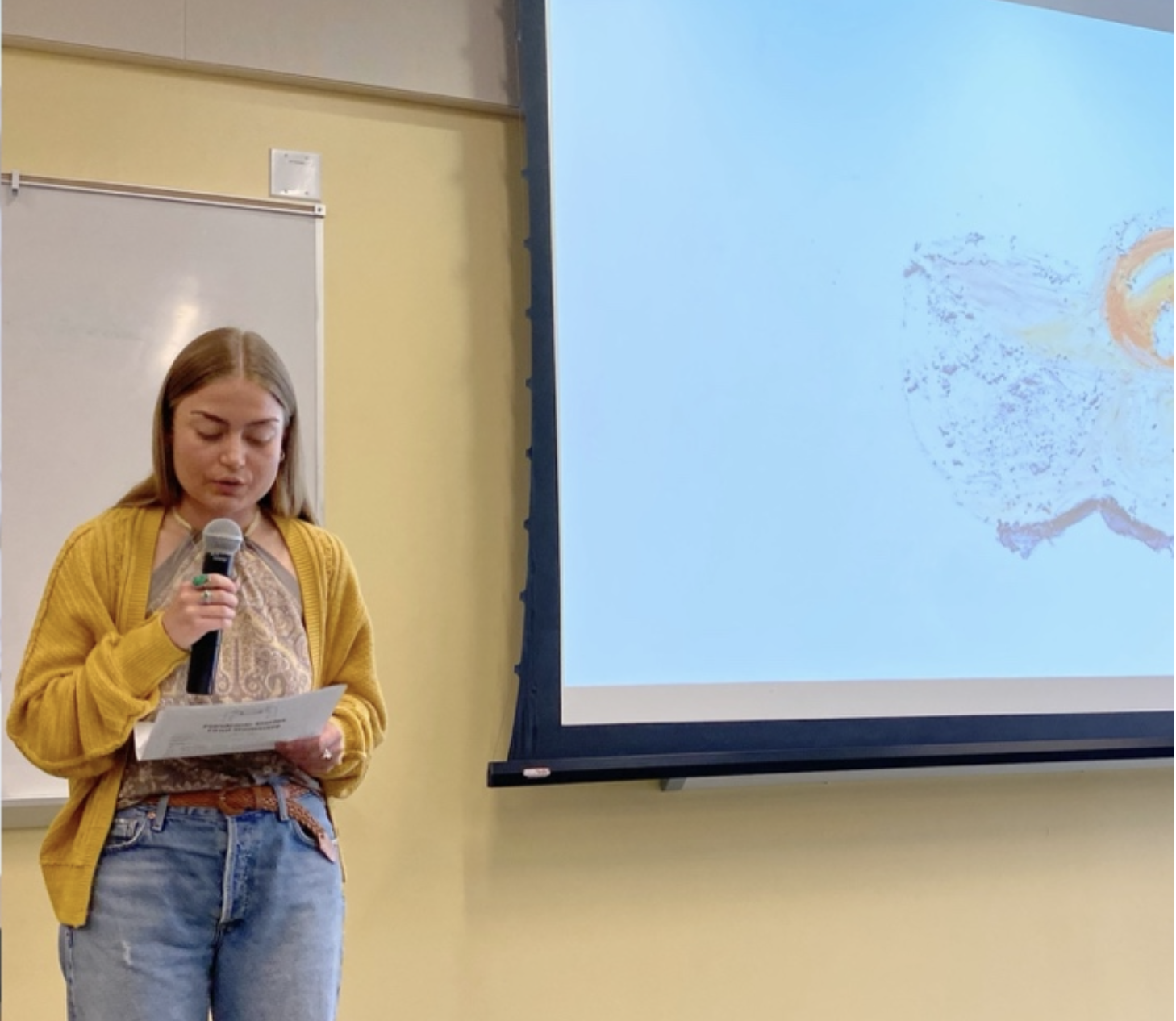 Katherine McCabe struck a tone of dark humor in her presentation, with many jokes. Her personal narrative reflected on her difficult experience with brain injury and her decision to drop out of school prior to the pandemic in February 2020. “My actual piece is not as funny. I wanted to make it a little bit more serious and tell in detail the things I actually did throughout the pandemic,” McCabe said in an interview after the event. “But I think that humor is a really great way of making deep and difficult subjects more engaging. It's a great way to communicate serious subjects without scaring people off.”