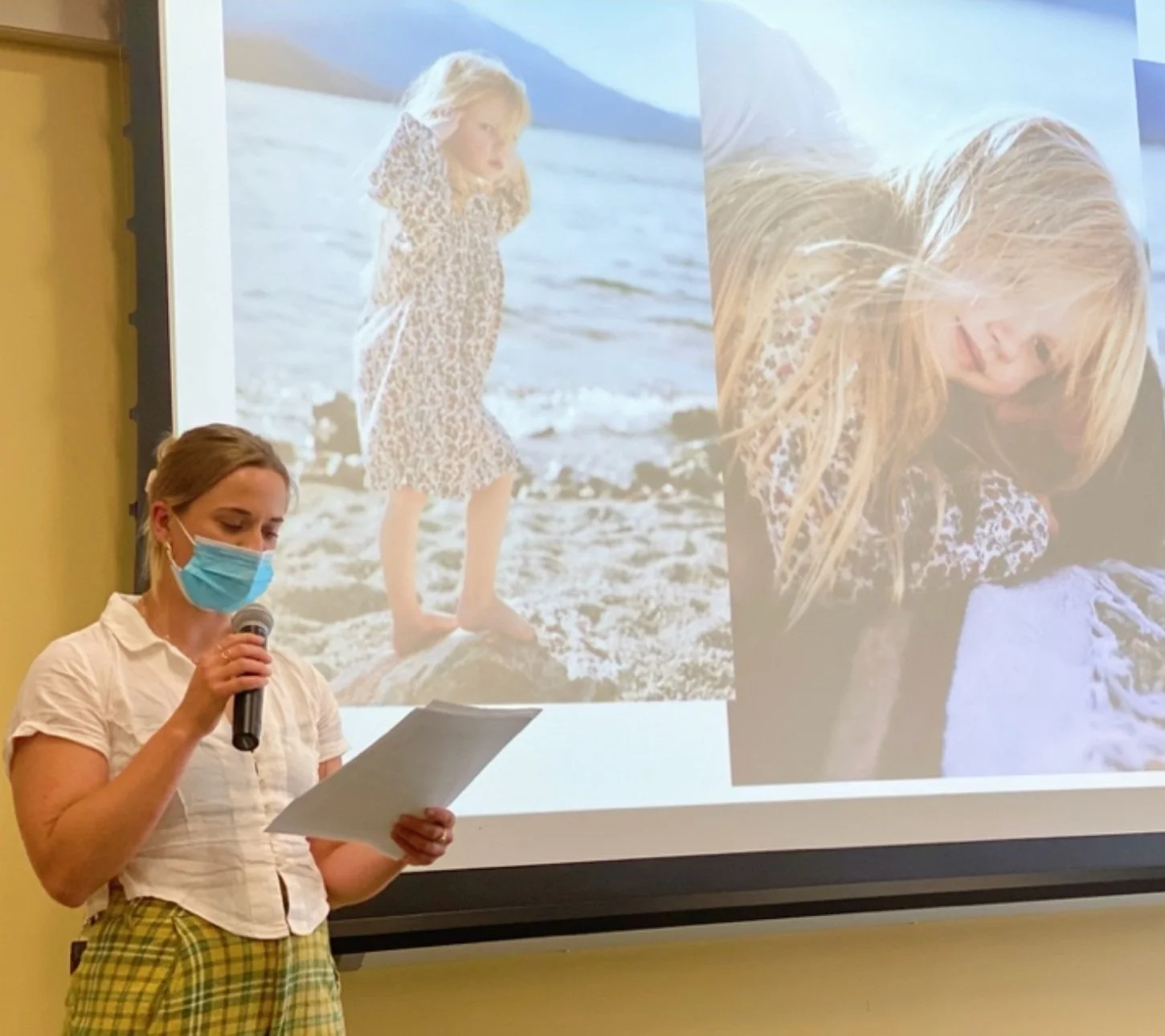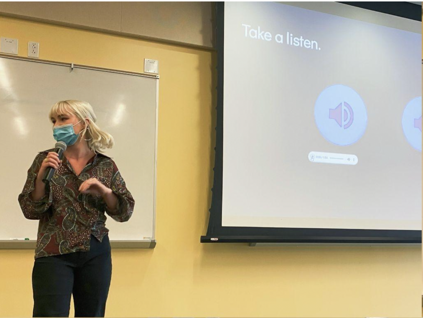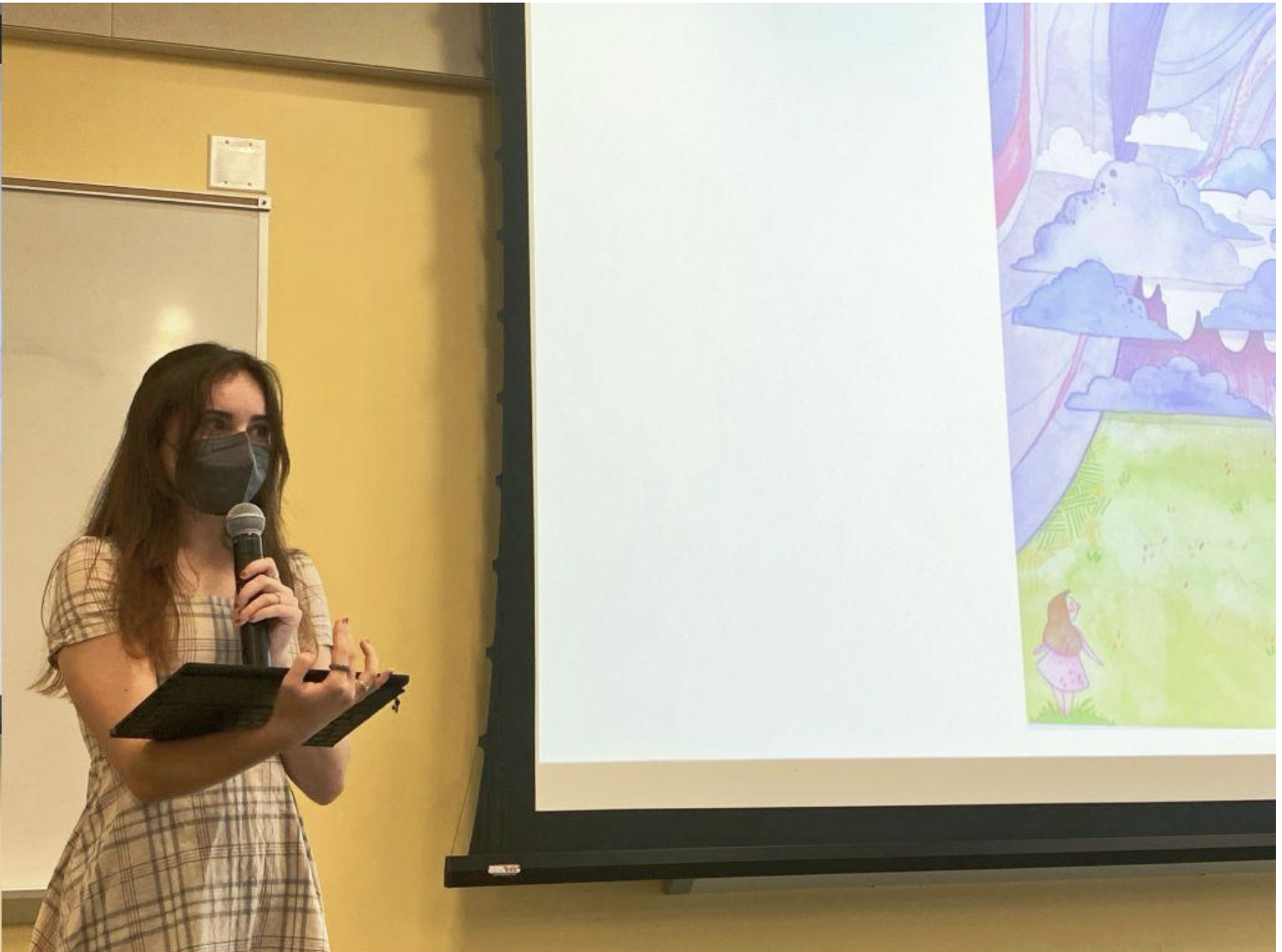 Katherine McCabe struck a tone of dark humor in her presentation, with many jokes. Her personal narrative reflected on her difficult experience with brain injury and her decision to drop out of school prior to the pandemic in February 2020. “My actual piece is not as funny. I wanted to make it a little bit more serious and tell in detail the things I actually did throughout the pandemic,” McCabe said in an interview after the event. “But I think that humor is a really great way of making deep and difficult subjects more engaging. It's a great way to communicate serious subjects without scaring people off.”
