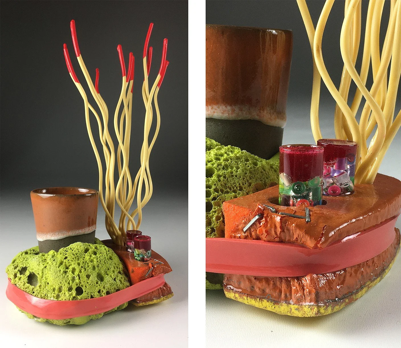 After Penn State, he spent time at the University of Illinois for a post-baccalaureate. His angsty, metaphysical projects during that time taught him that “ceramics doesn't need to be an ‘it.’ Maybe it can be a prop, or part of an image.” These projects built up his portfolio, earning him admission into the University of Washington for a Master of Fine Arts.